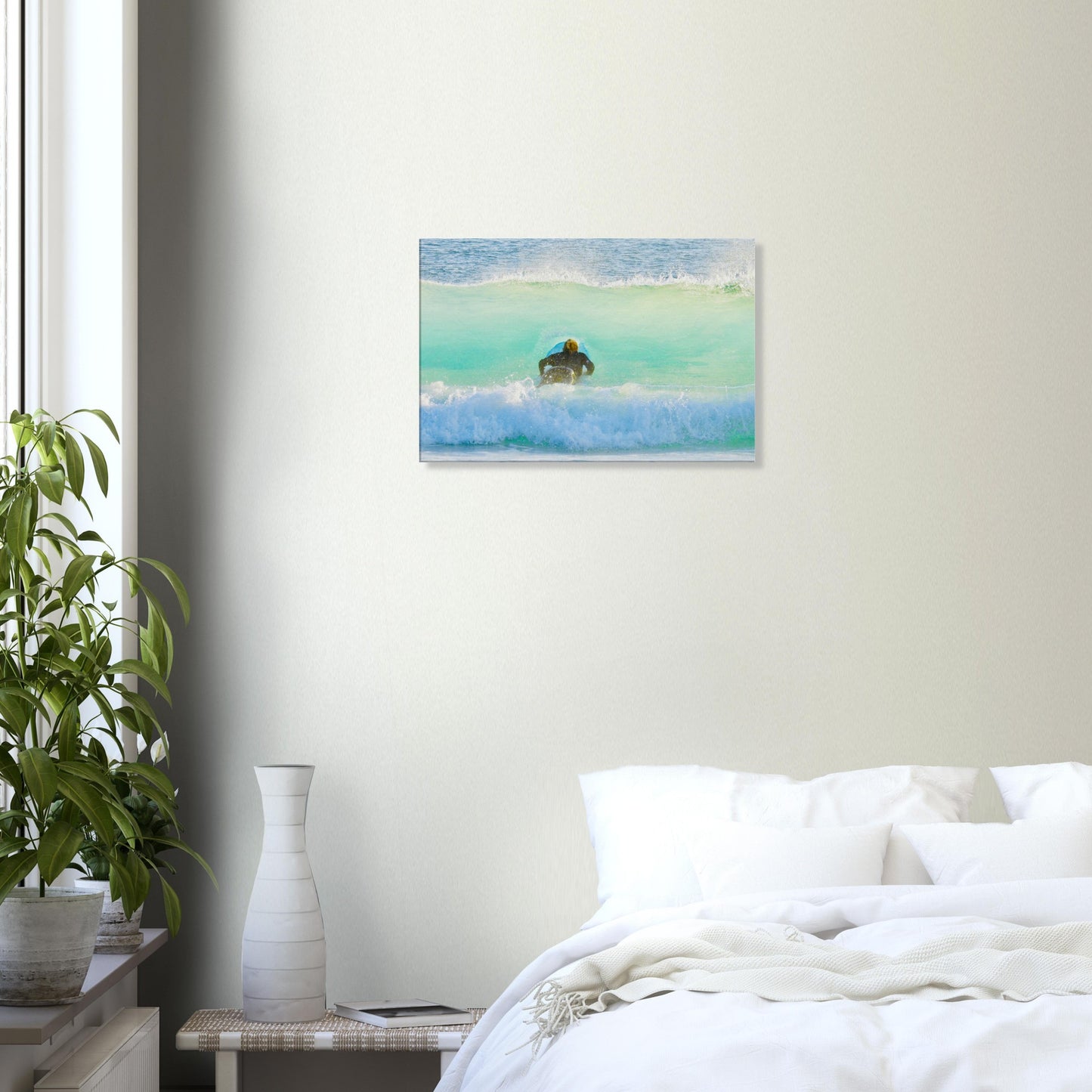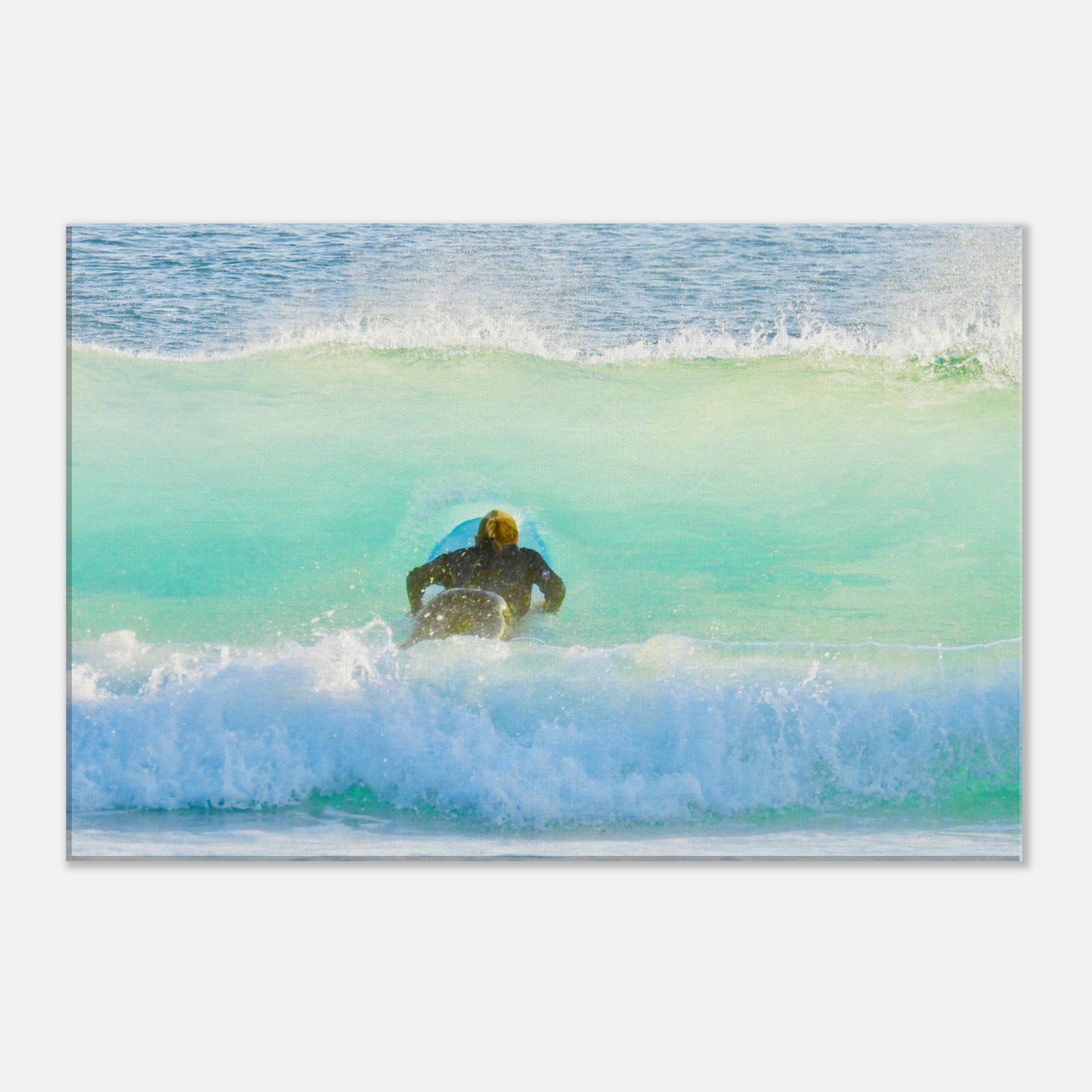 Take a look at our Optical Illusion Wave Canvas! This artwork captures a surfer seemingly navigating through a mesmerizing hole in a wave, leaving you to wonder if the blue hole is an illusion or the surfer’s board.