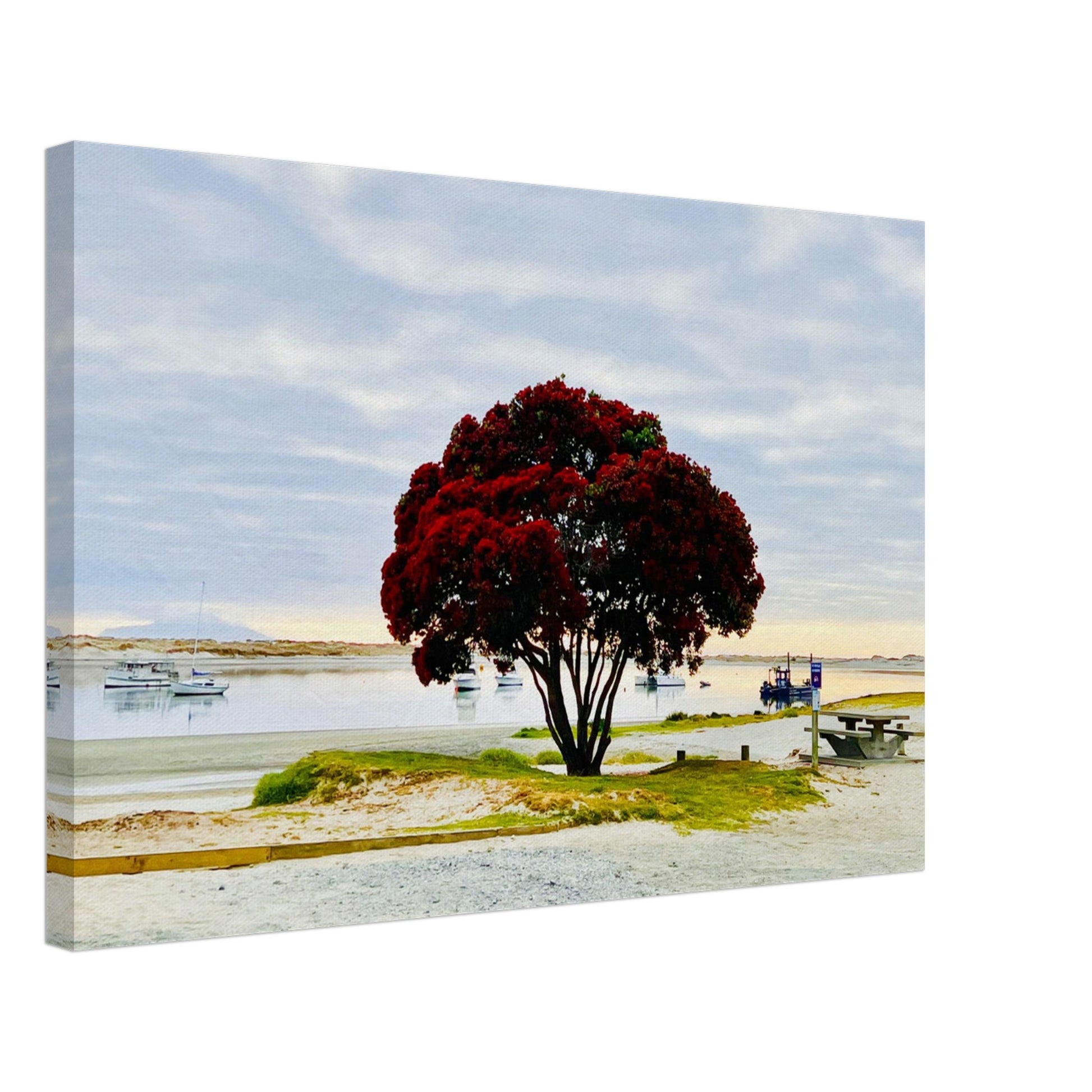 Transform your living space with our stunning Pohutukawa Canvas Print, featuring the iconic flowering Pohutukawa tree, known as New Zealand's Christmas tree, set against the serene backdrop of Mangawhai Heads Estuary.